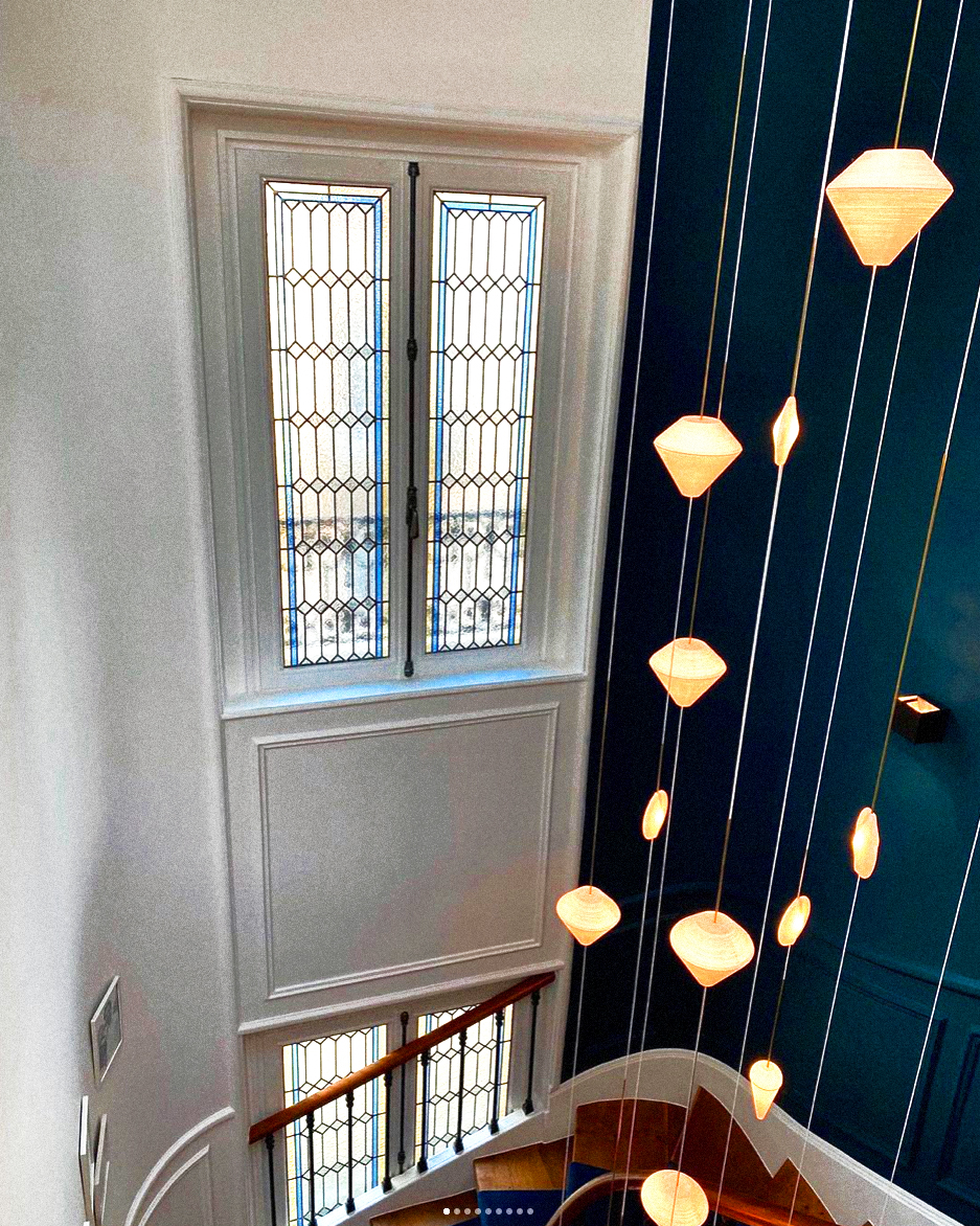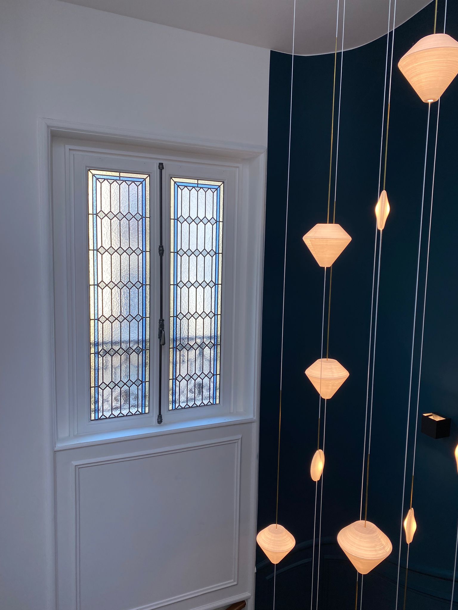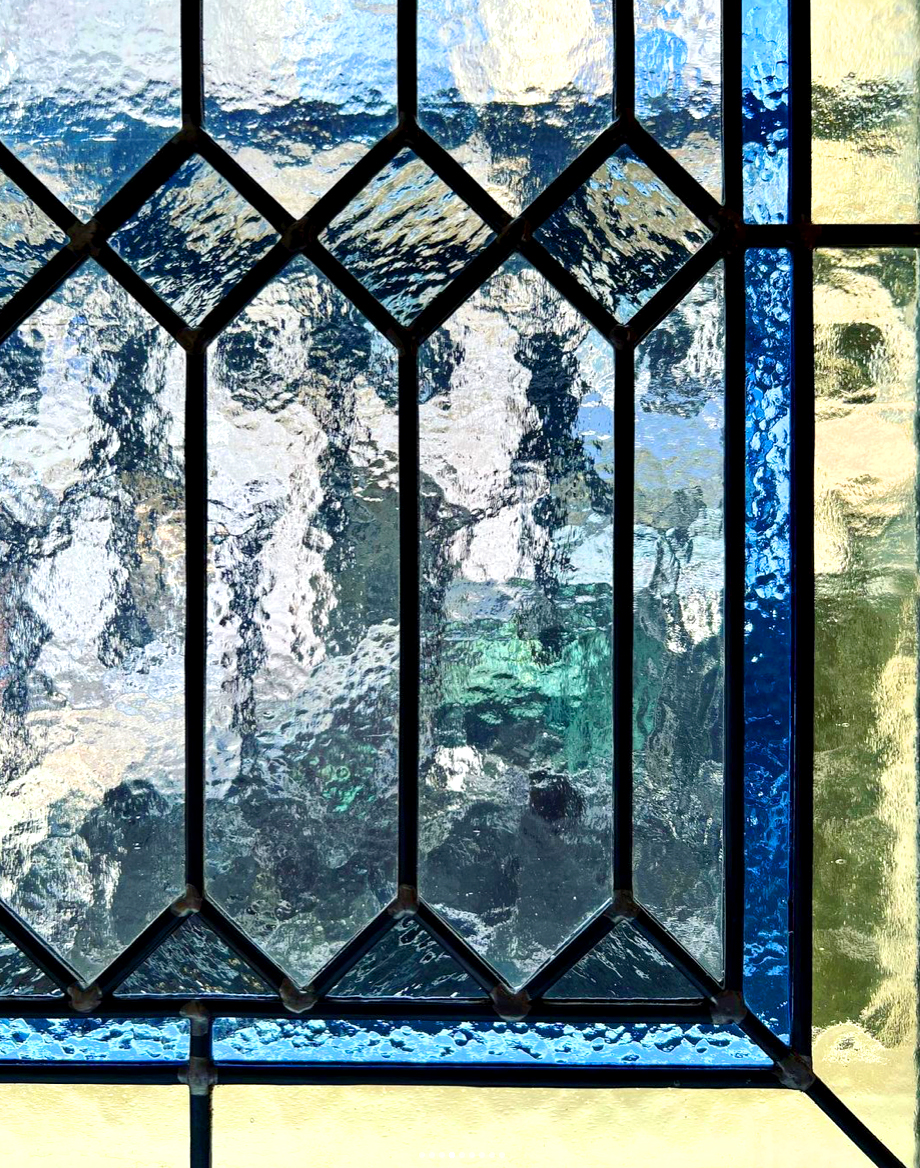 These staircase stained glass pieces are inspired by the 1900 style, combining classic and modern geometric patterns in tones of blue, yellow, and transparency. Each stained glass panel blends precise and balanced shapes, creating a subtle interplay between vibrant colors and the transparency of the glass, while allowing natural light to diffuse harmoniously through the space.